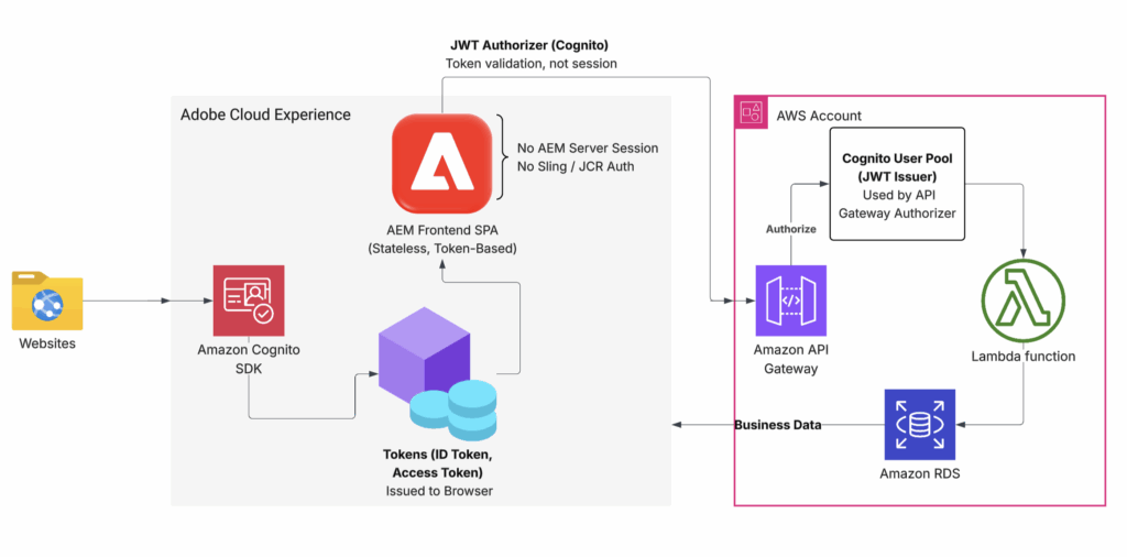 This article explored a frontend-first authentication model using Amazon Cognito with Adobe Experience Manager as the experience layer.