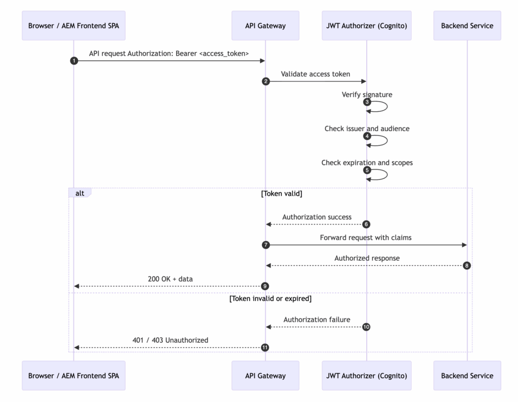 Access token is required and validated by a JWT authorizer. - AEM backend → API Gateway