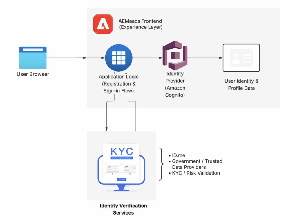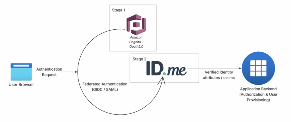 Early implementations usually start with Amazon Cognito for login and basic identity needs. When higher assurance is required, ID.me can be added for stronger identity verification.