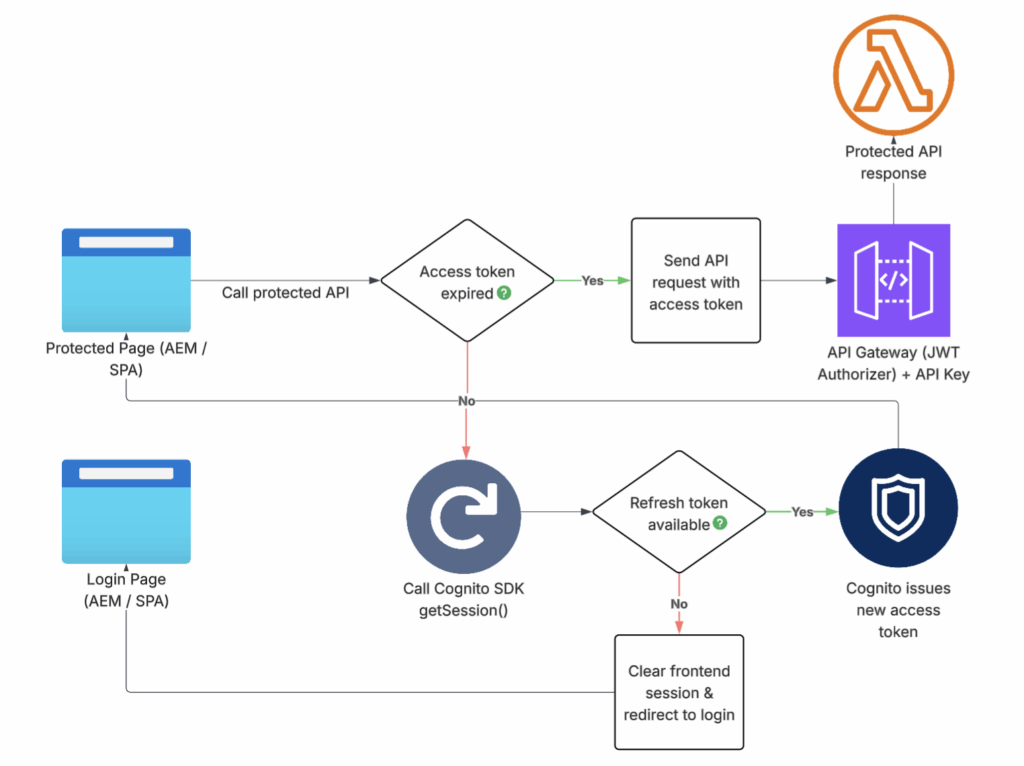 If a valid refresh token exists, Cognito SDK retrieves a new access token and request continues without user interruption.