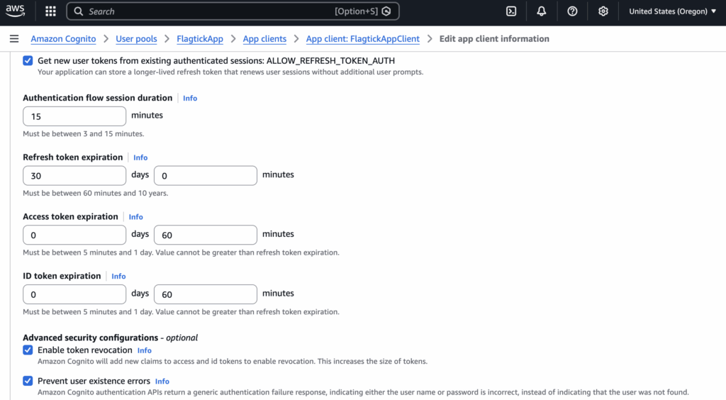 In terms of token control, the lifetime of access tokens, ID tokens, and refresh tokens is configured at the App Client level in Amazon Cognito. These settings are managed directly in the AWS Management Console, allowing teams to define how long tokens remain valid and how sessions are refreshed, as shown below.