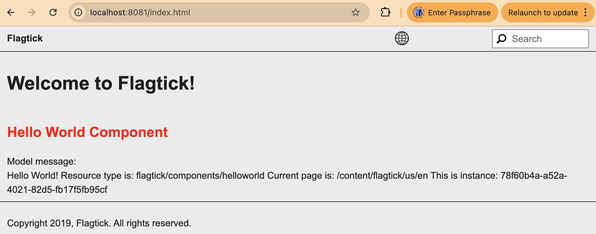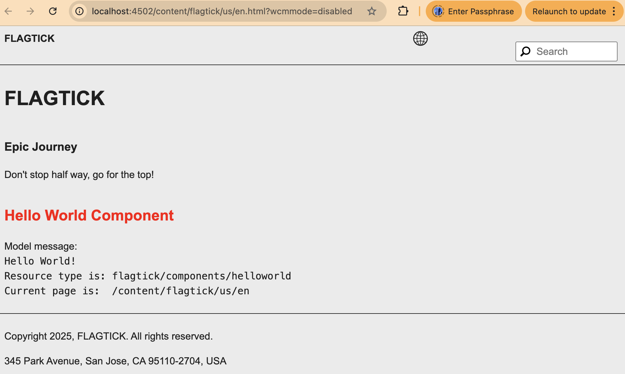 http://localhost:4502/content/flagtick/us/en.html?wcmmode=disabledConfirm that your AEM-rendered page matches your static preview in layout and styling.