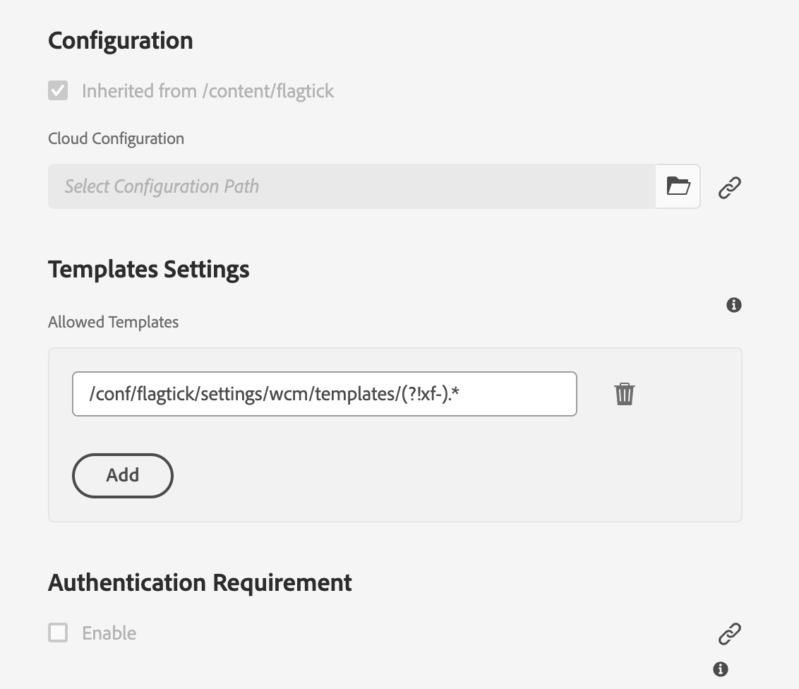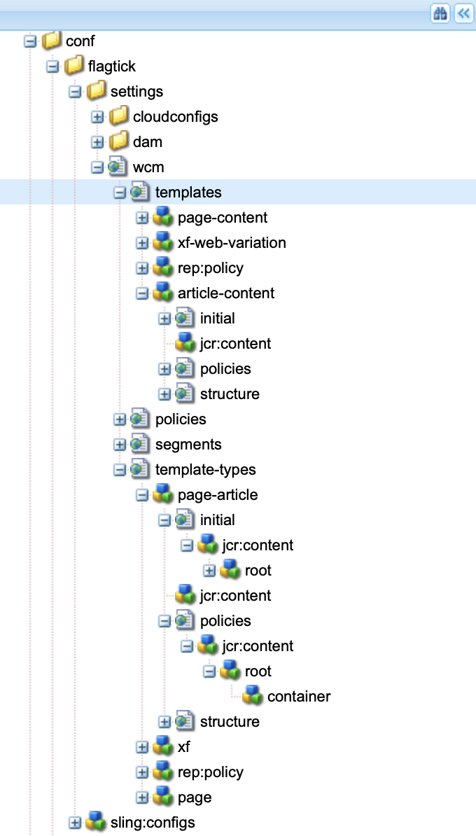 /conf/<project>/settings/wcm/template-typesEach type — such as page or xf — contains initial, structure, and policies nodes that define how the template behaves and what authors can edit.
