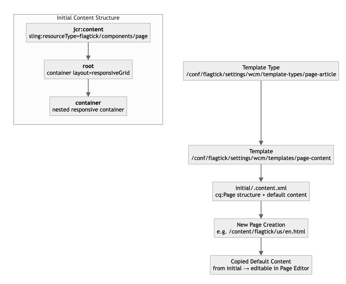 </jcr:root>Every template type has its own content.xml — that is where the metadata and page structure live. The initial/.content.xml is basically the blueprint AEM clones each time you make a new page.
