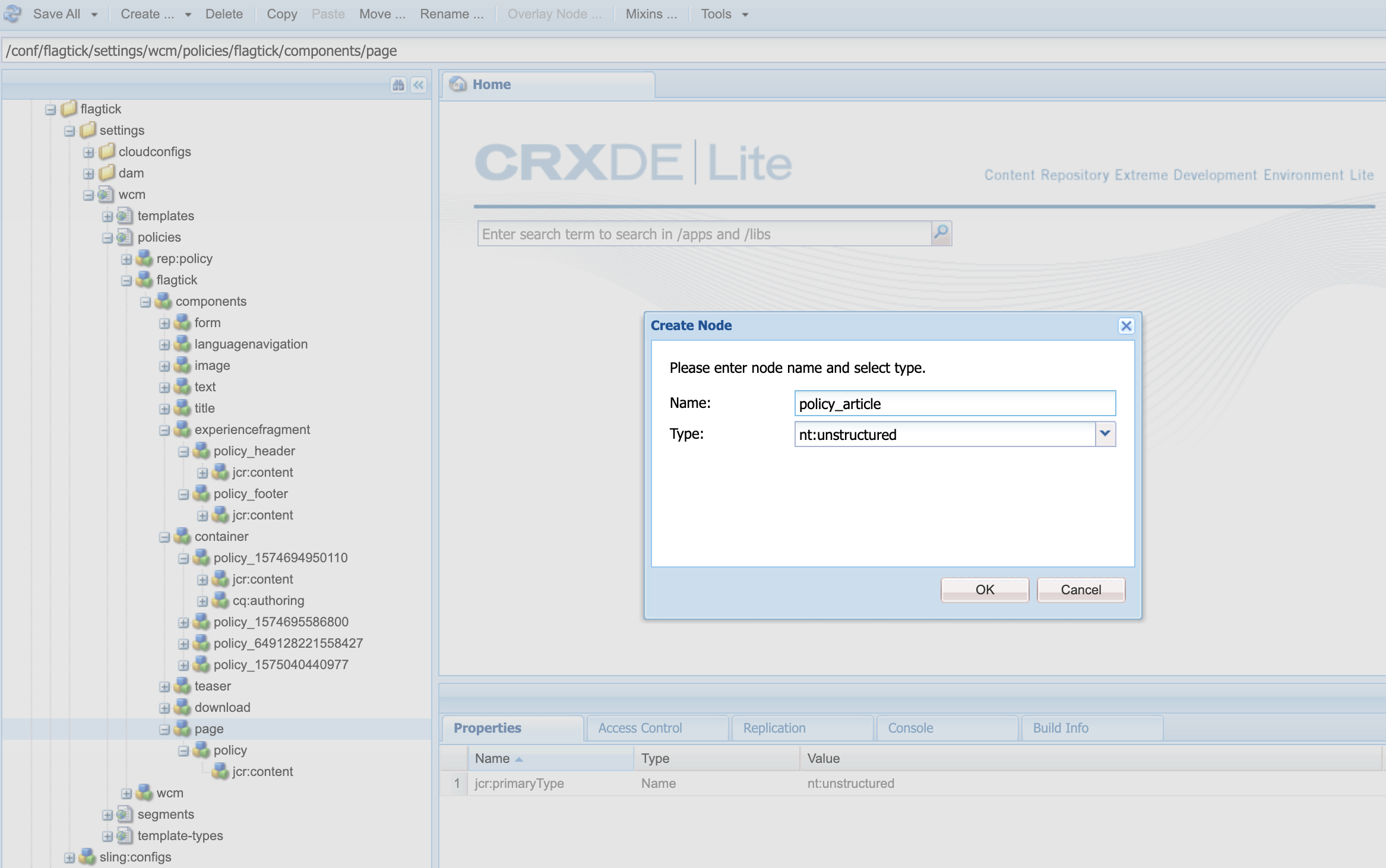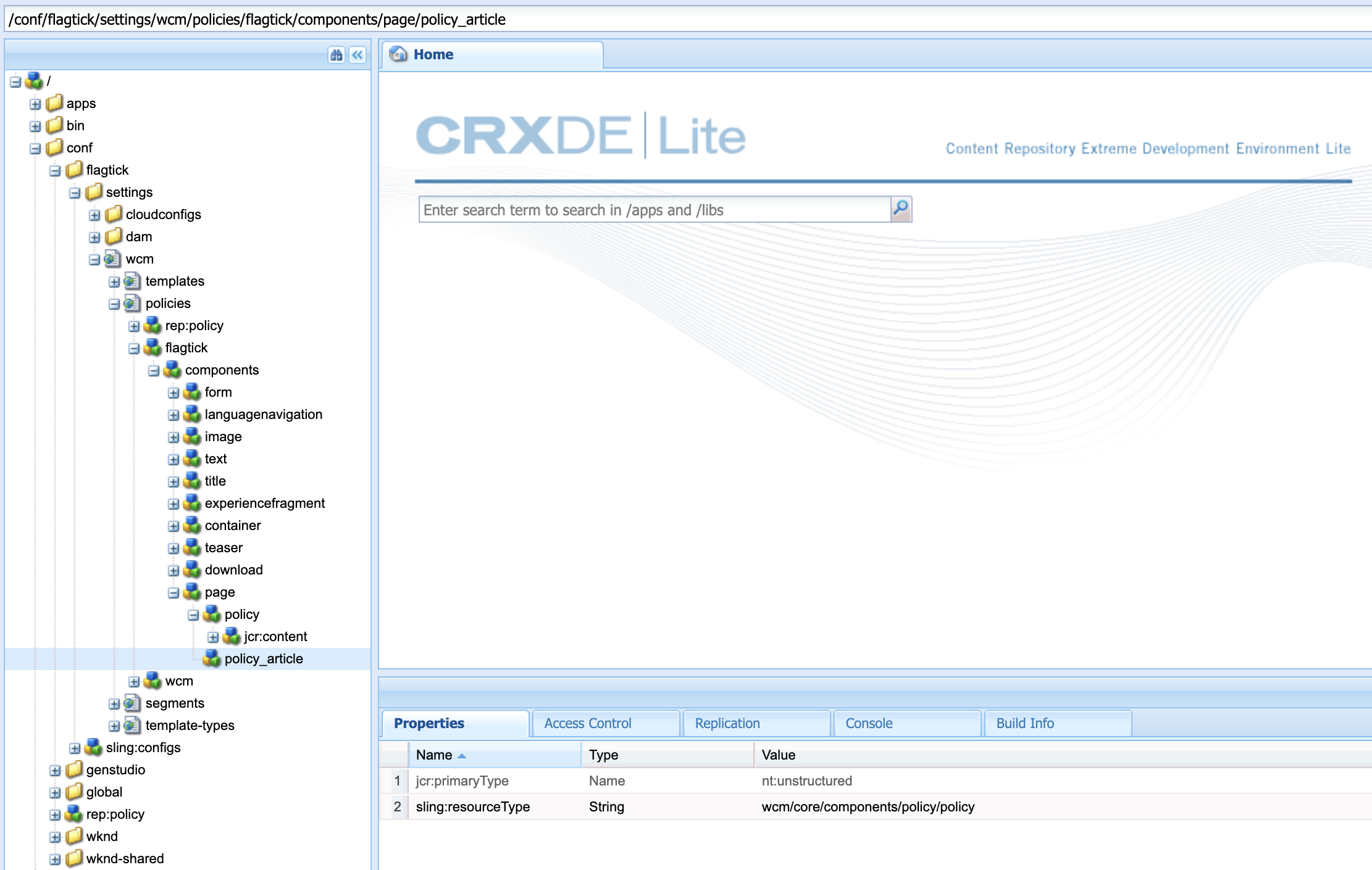 </jcr:root>In CRXDE Lite, go to /conf/flagtick/settings/wcm/policies/flagtick/components/page and create a new node named policy_article.