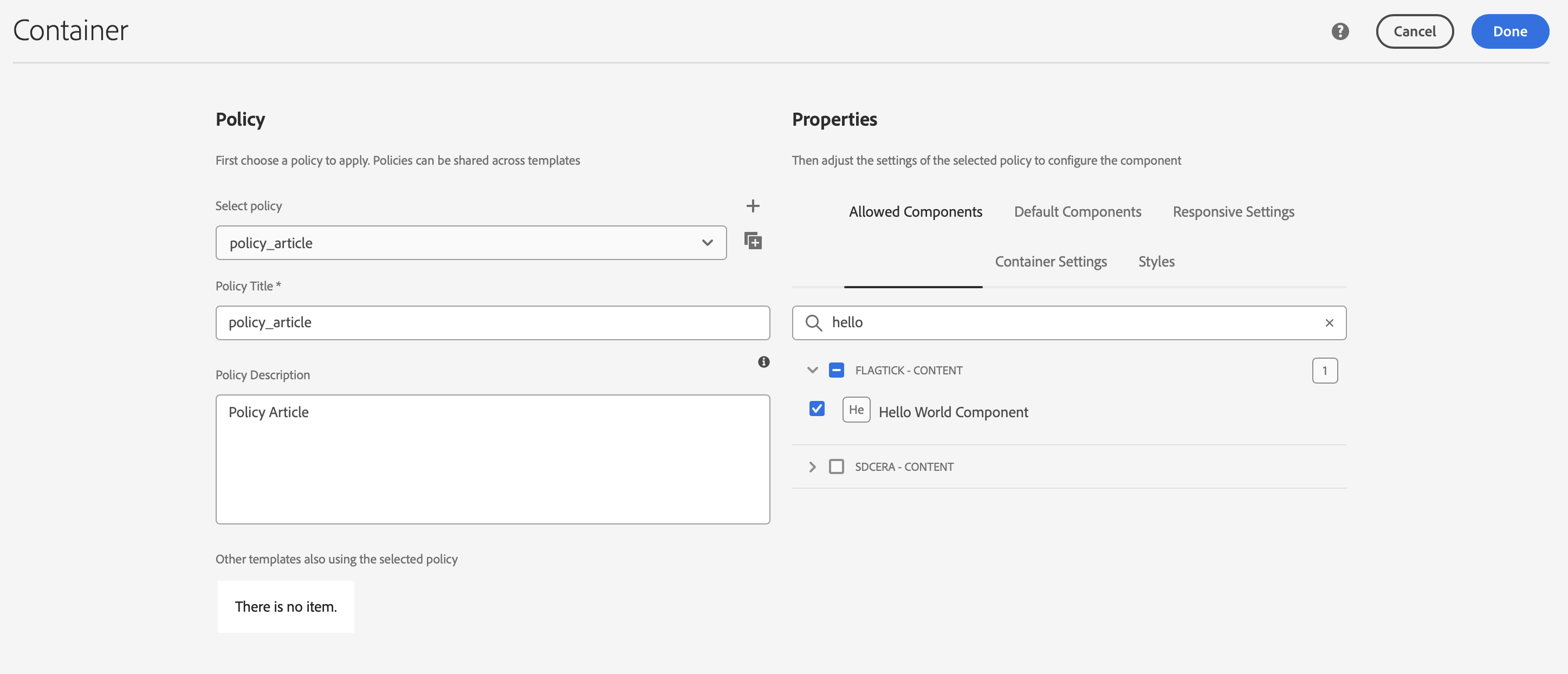 Now that we have created the policy_article node, let us see how AEM recognizes it and how policies link to editable areas inside your template.