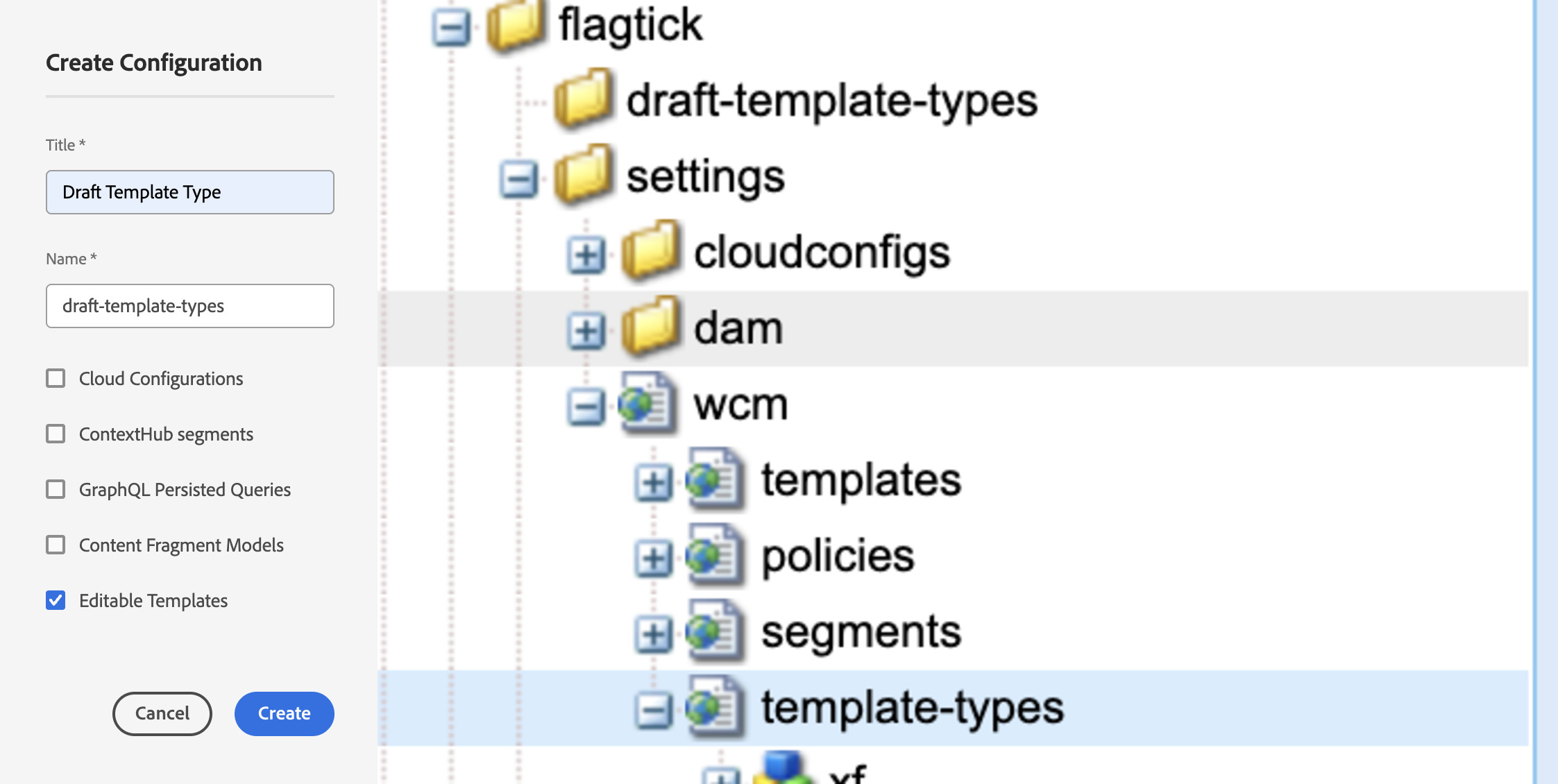 └── policies/...AEM automatically creates subfolders when options like Editable Templates are enabled — generating /conf/flagtick/draft-template-types for draft templates.