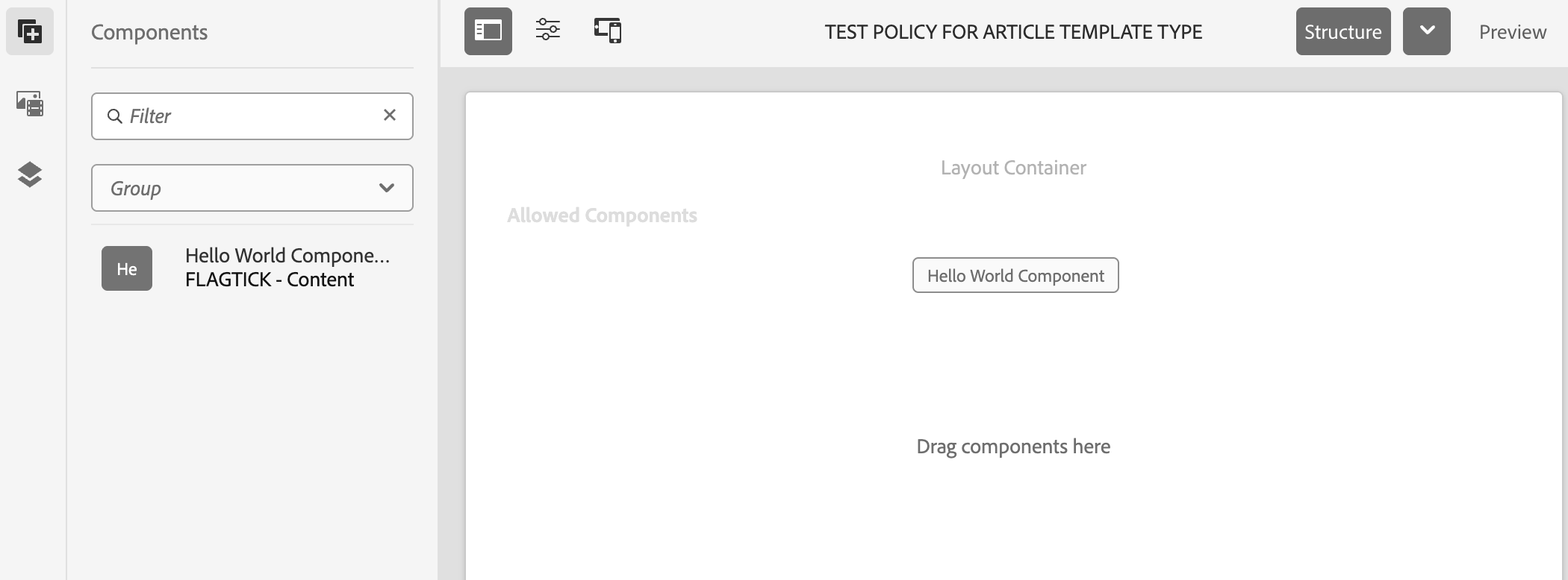 Drag one into the layout to test — container policies only work when allowed components are defined.
