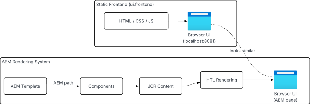 While the frontend delivers pre-built HTML, AEM builds pages at runtime by combining: