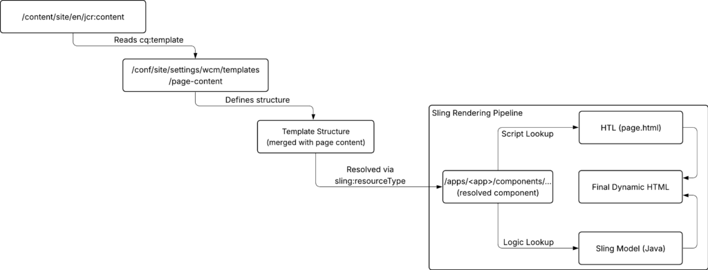 These are not separate layers—they work together to produce the final page. At its core, an AEM page is not HTML—it is a composition of structure, content, and runtime rendering: templates define layout, JCR stores content, and components render the final output.