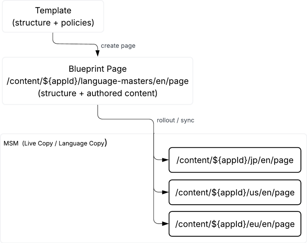 From the Blueprint, AEM MSM (Live Copy / Language Copy) rolls out and synchronizes content to regional pages under /content/${appId}.