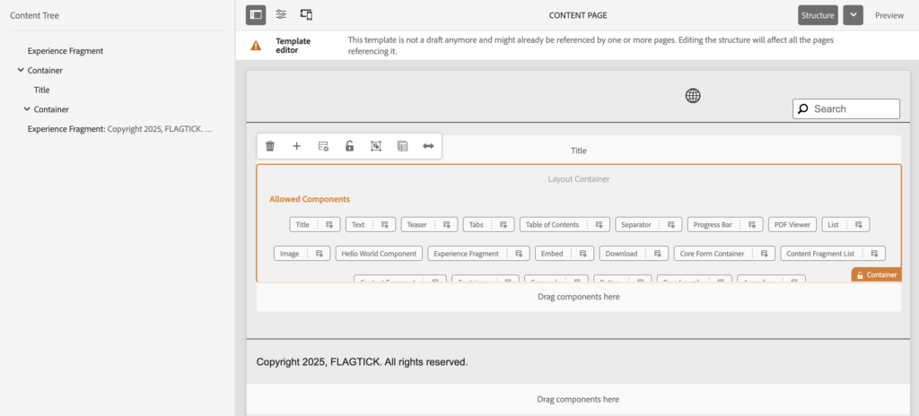 └── experiencefragment-footer (locked)Now consider a variation where only a single editable container is defined in the structure: