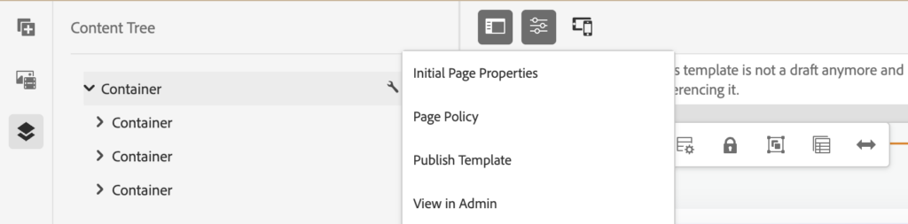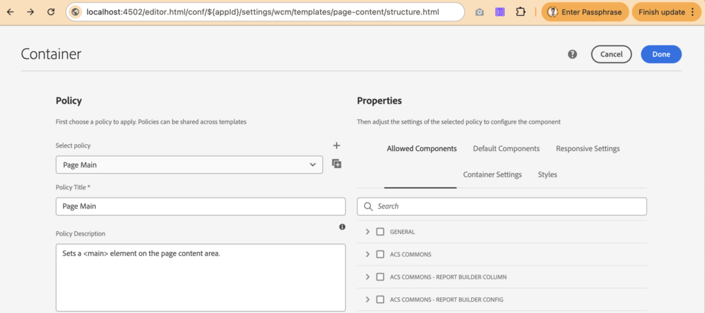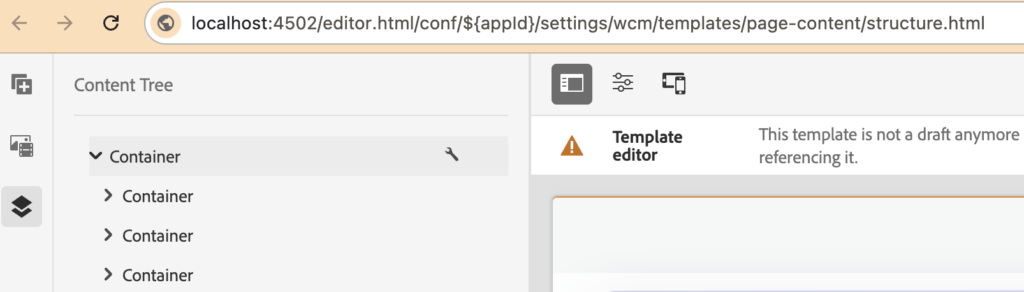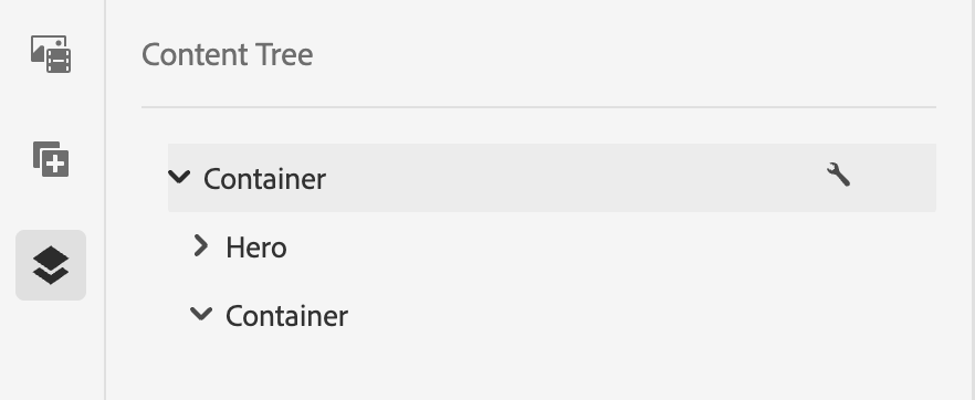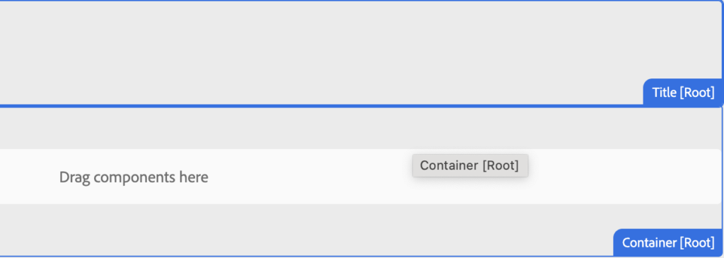 </container>In the editor, nodes marked with editable="{Boolean}true" define authoring areas. Containers provide drop zones for adding and arranging components, while leaf components such as Title allow only content editing.