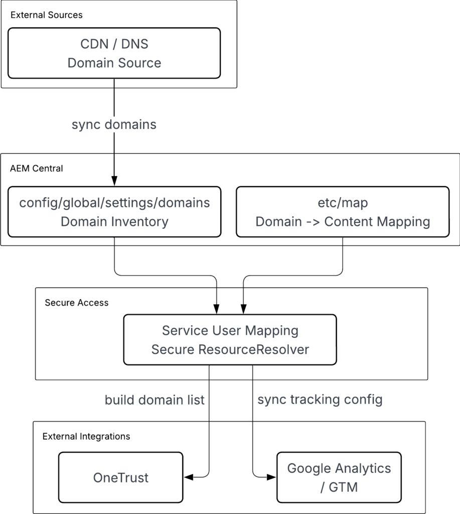 In complex setups, subdomains may be delegated to different DNS providers. This further fragments domain sources and reinforces the need for a centralized domain inventory inside AEM.