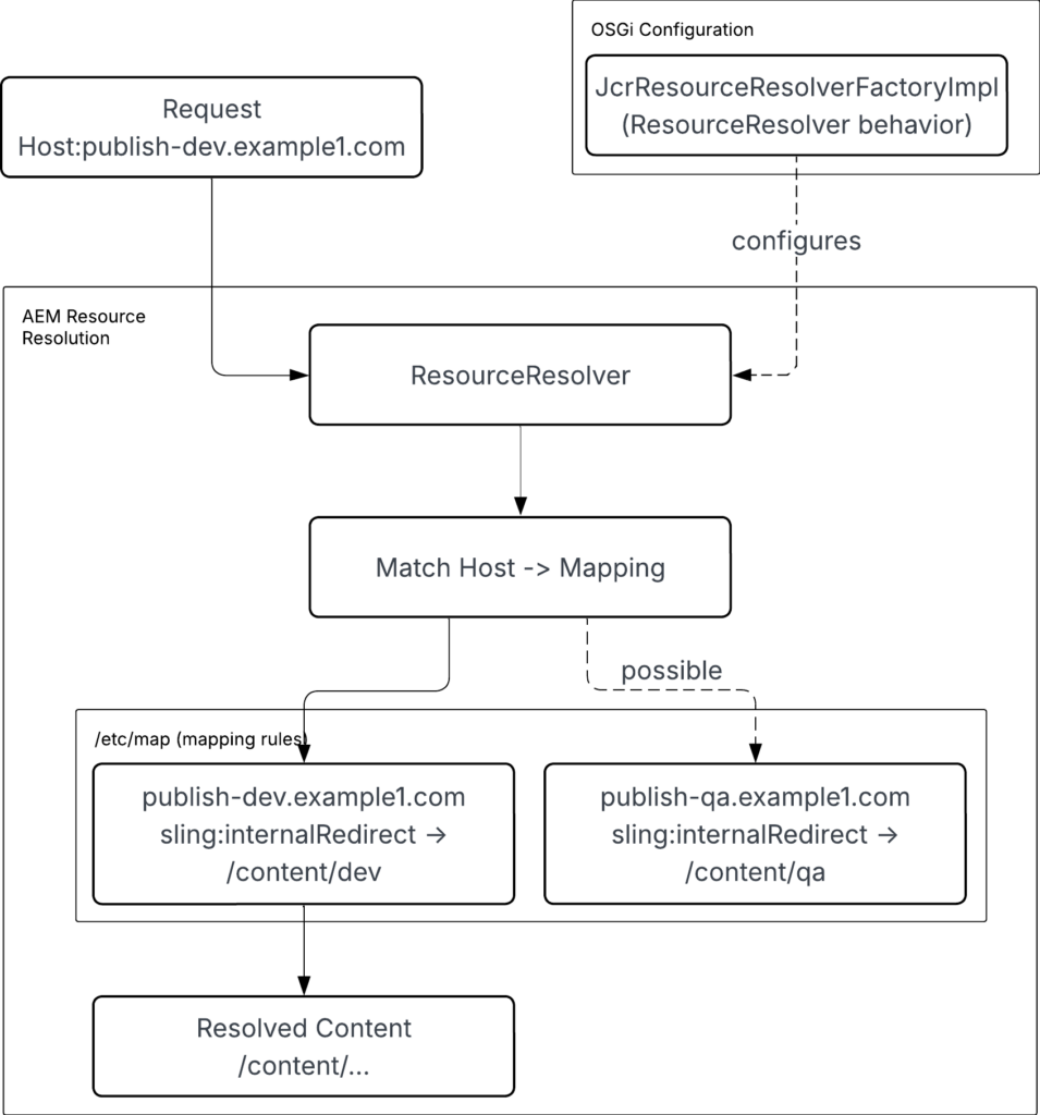 AEM resolves domains through ResourceResolver. It reads /etc/map, matches incoming Host, and maps request to content.