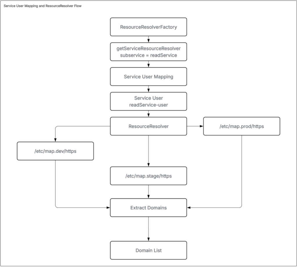 Implementation below shows how code uses ResourceResolver from subservice to read /etc/map paths and collect domain values.