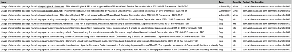 [WARNING] [region-deprecated-api] com.adobe.acs:acs-aem-commons-bundle:5.1.2: Usage of deprecated package found : ch.qos.logback.classic.net : This internal logback API is not supported by AEM as a Cloud Service. Deprecated since 2022-01-27 For removal : 2025-08-31 (com.flagtick:flagtick.all:1.1.0-SNAPSHOT|adobe/consulting:acs-aem-commons-ui.apps:5.1.2)In this example, ACS Commons appears in your project dependencies, so upgrading it is the correct action.
