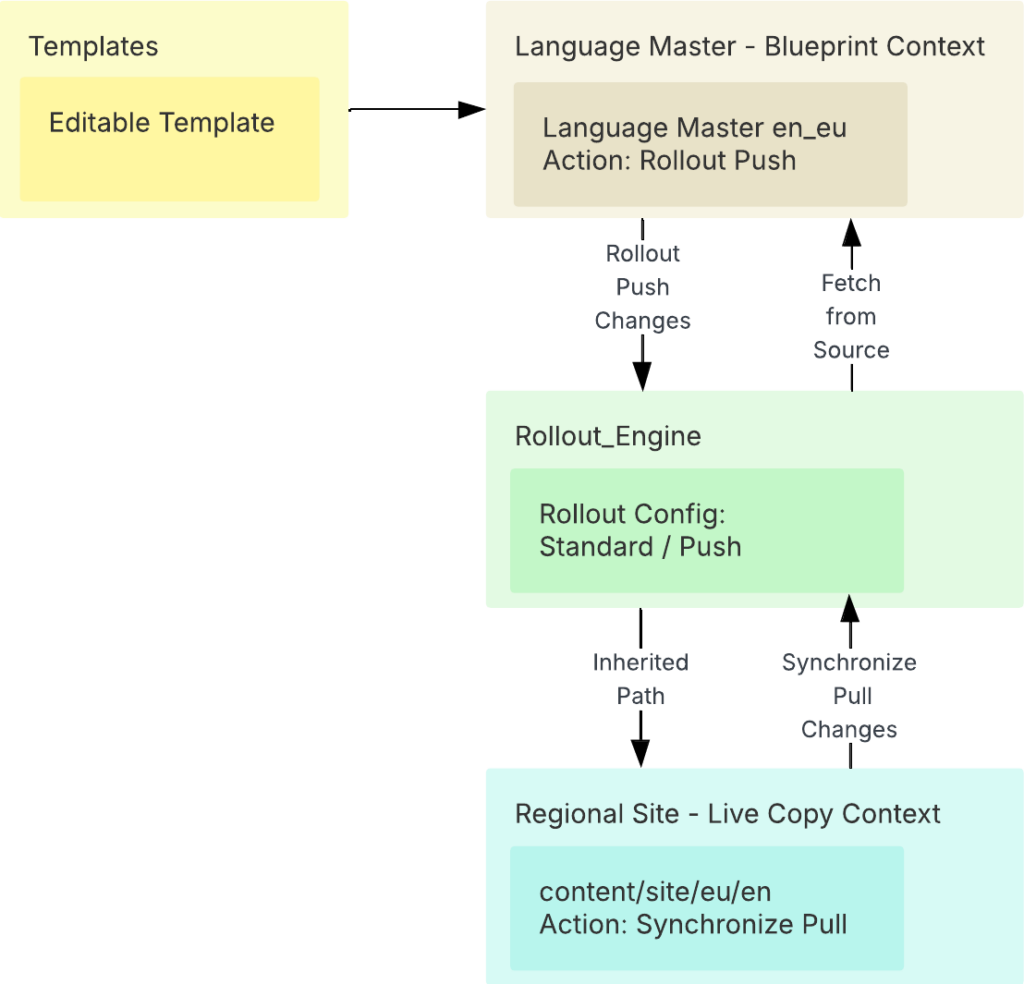 Below, blueprint pages (source) push content to regional sites via rollout and synchronization.
