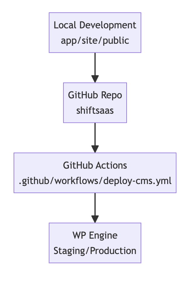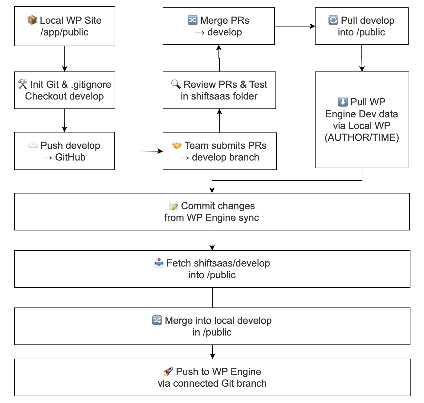When pushing to a WP Engine environment (dev, staging, or production), work inside the site/app/public folder. Commit any changes from Local WP sync before pulling from shiftsaas/develop to avoid merge conflicts and keep your Git history clean. (Only files are pushed — database stays local).
