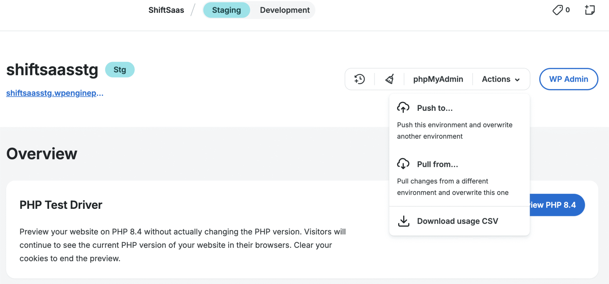In practice, we clone the repo or change the remote to shiftsaas to manage development on WP Engine. You can do the same with staging and master branches to handle staging and production environments.