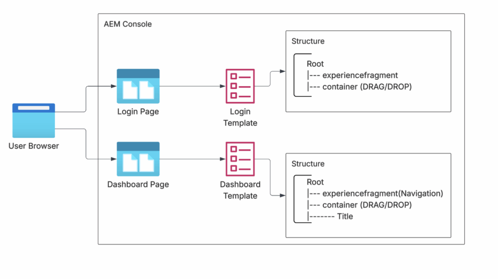 Once authentication is completed on the frontend, the logic is encapsulated into reusable AEM frontend components. These components are applied at the template level, allowing pages such as Login and Dashboard to inherit consistent authentication structure and behavior through their respective templates, as illustrated in the diagram.