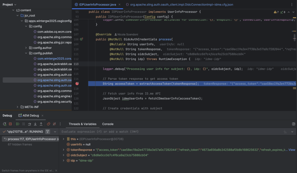 After ID.me completes verification, control returns to AEM via the callback to resume the OIDC flow. Debugging shows how this callback is handled inside AEM.
