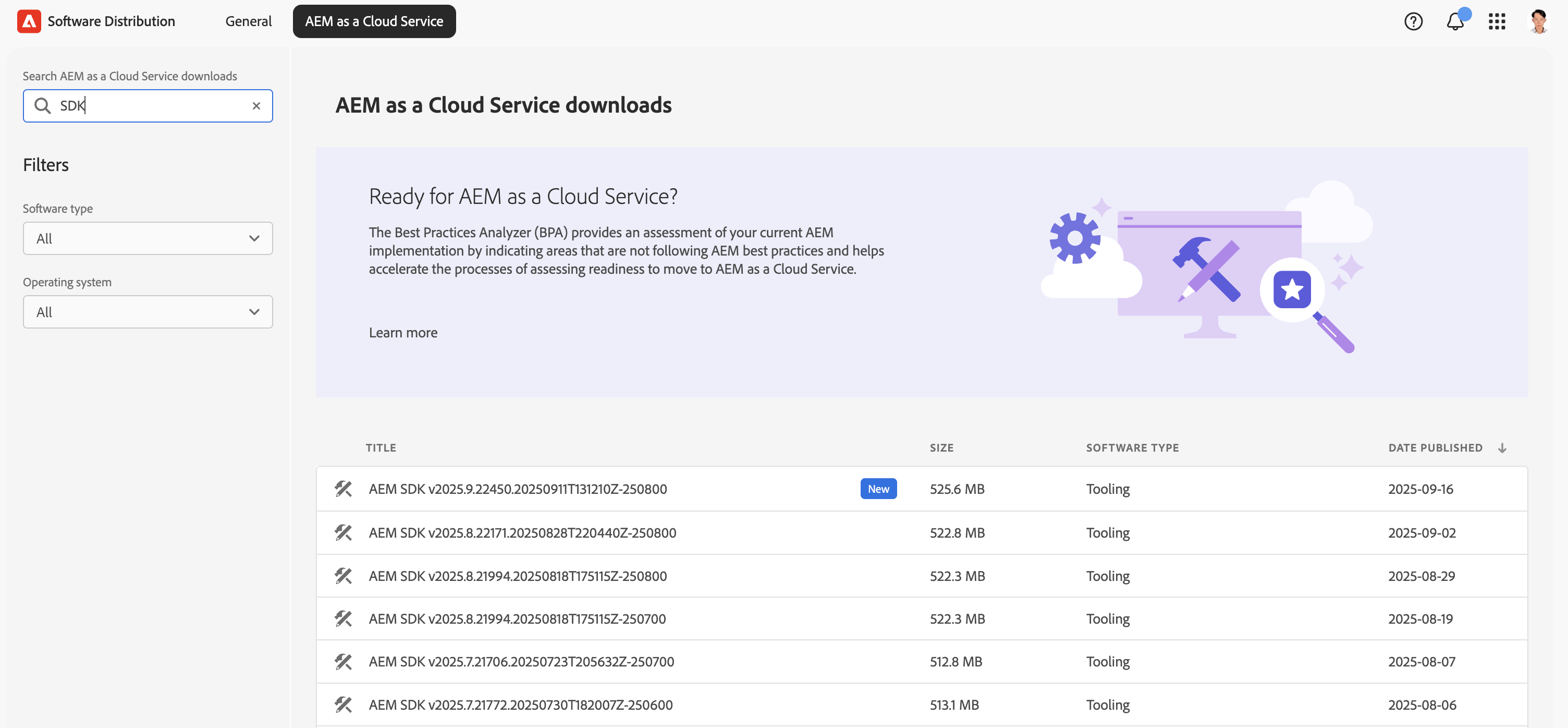 Download the latest AEM SDK from Adobe’s Software Distribution portal to mirror Cloud Service locally and validate configurations with the most recent release.