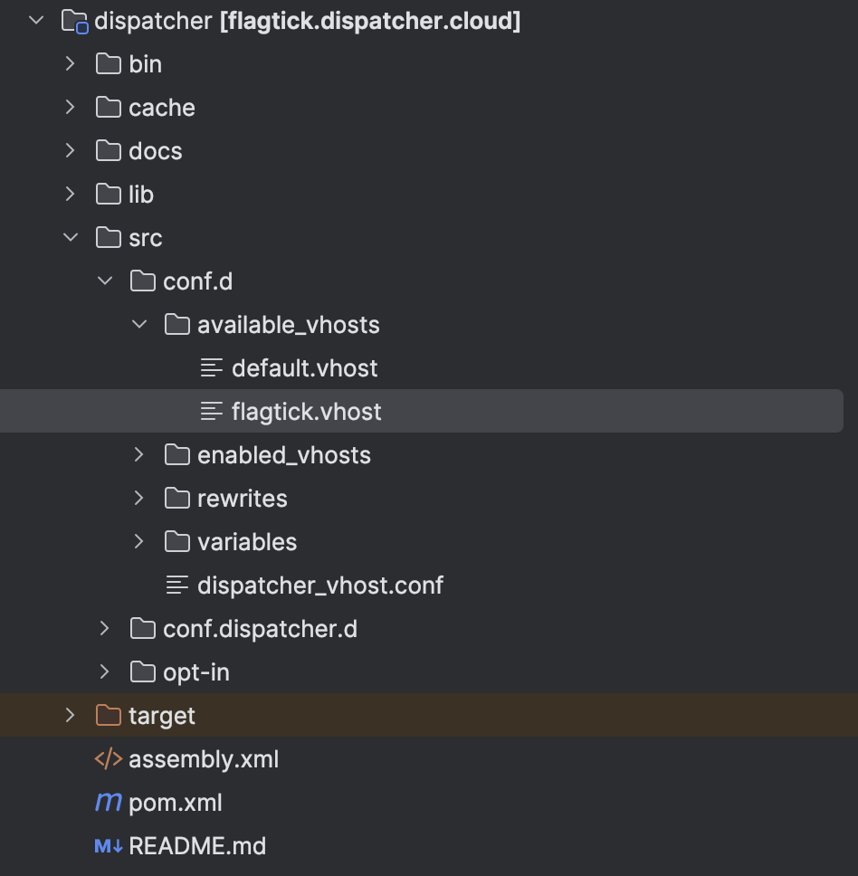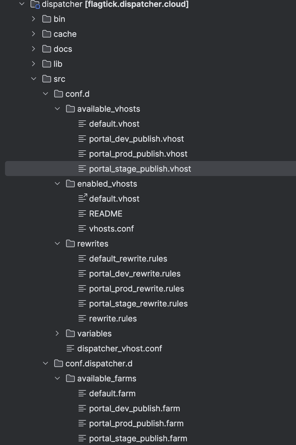 For example, with option 1 we assume that flagtick.com points to another server, while portaldev.flagtick.com targets AEMaaCS. In this case, we would use flagtick.vhost (the name flagtick can be changed to custom.vhost or any other name when using option 1).