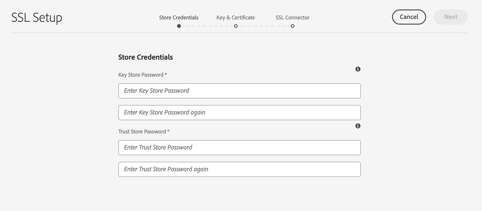 - Trust Store password → you also set it yourself. It secures the trusted CA certificates AEM will use.