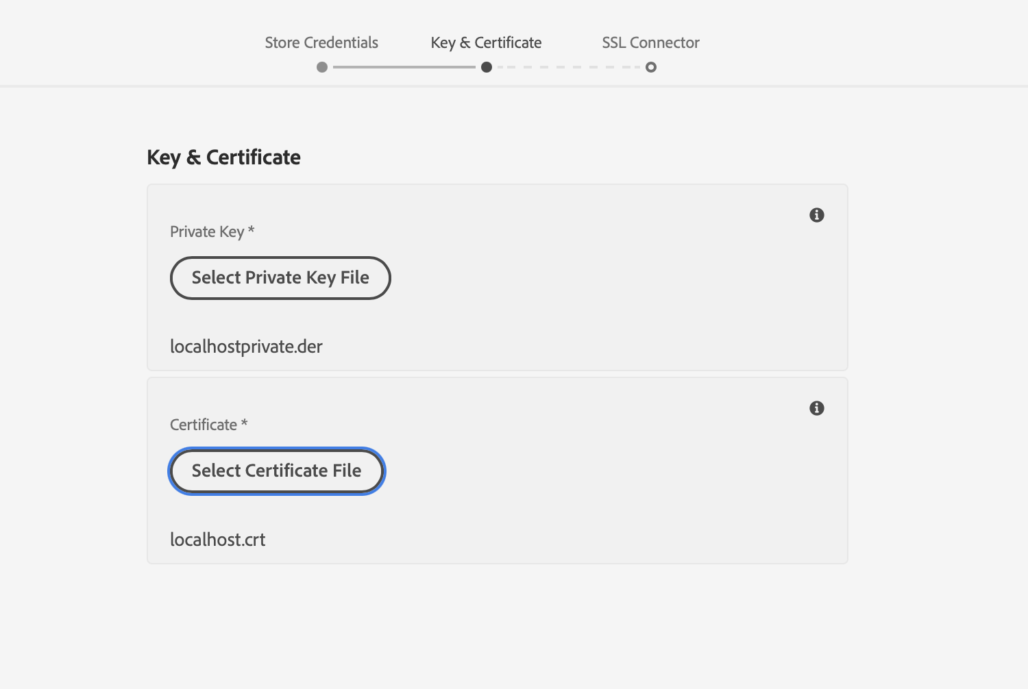 At the Key & Certificate step, upload your private key and certificate to finish SSL setup. For local use, Adobe offers a ZIP with a self-signed key (.DER) and cert (.CRT), valid until July 2028 with passphrase admin